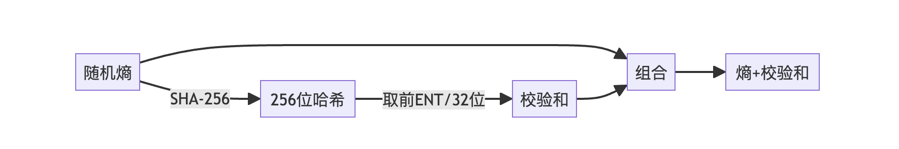 校验和(CS)通过对熵进行SHA-256哈希计算得到,取哈希结果的前ENT/32位: