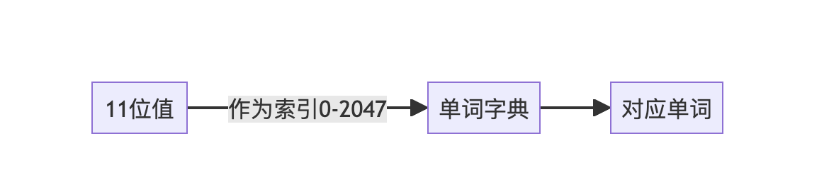 每个11位值作为索引(0-2047)映射到预定义的2048个单词列表中。