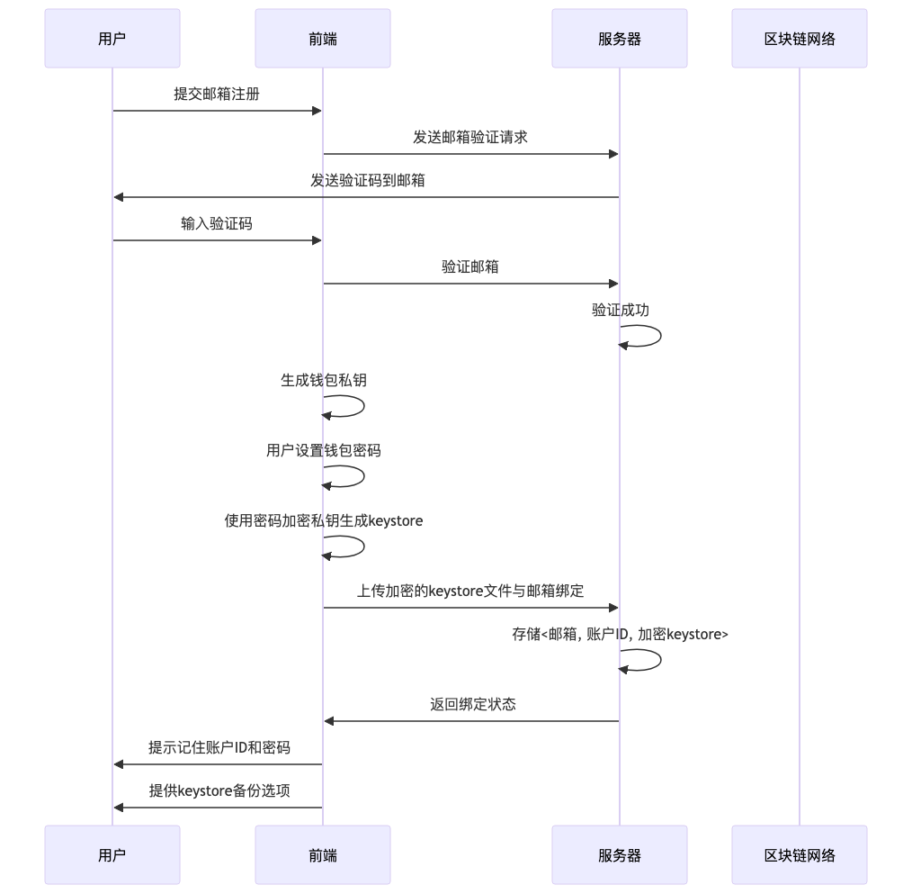 该系统允许用户通过邮箱或其他身份验证方式注册和管理区块链钱包,同时提供keystore文件的安全存储和恢复机制。用户自行保管钱包ID和密码,而服务器端安全存储加密的keystore文件。