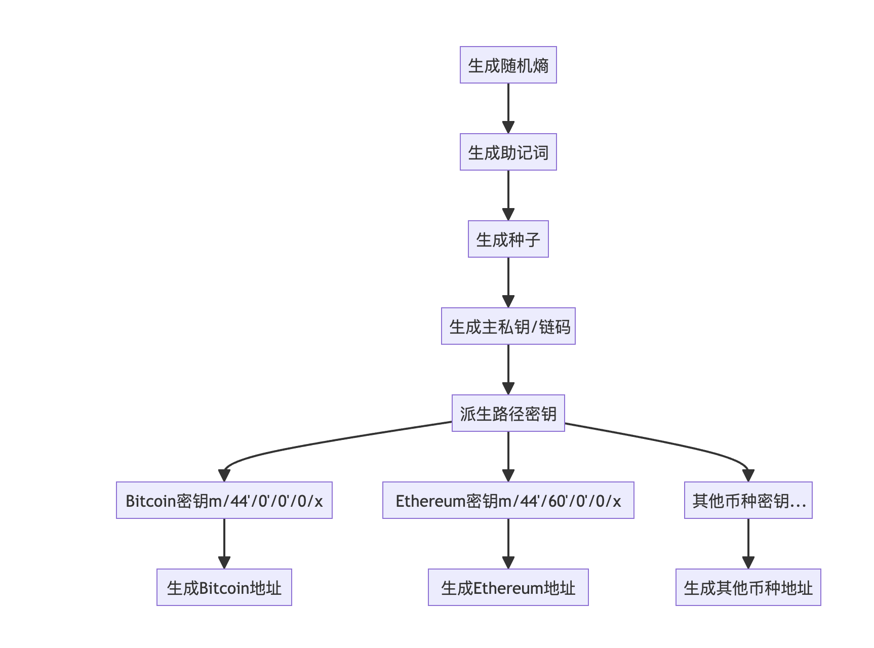 派生钱包密钥:按照BIP-44路径结构派生各个币种的密钥