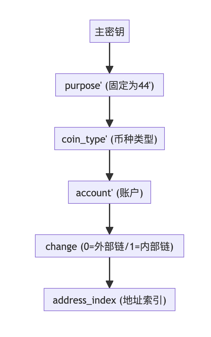 m / purpose' / coin_type' / account' / change / address_index这个结构以流程图表示为: