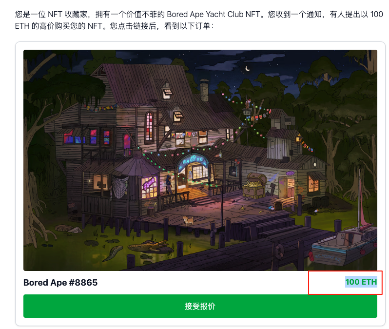 人类可读摘要:把“你将失去:BAYC #8865;你将收到:0 ETH”渲染为大号红色提示,覆盖任何站点自定义的“100 ETH”文案。