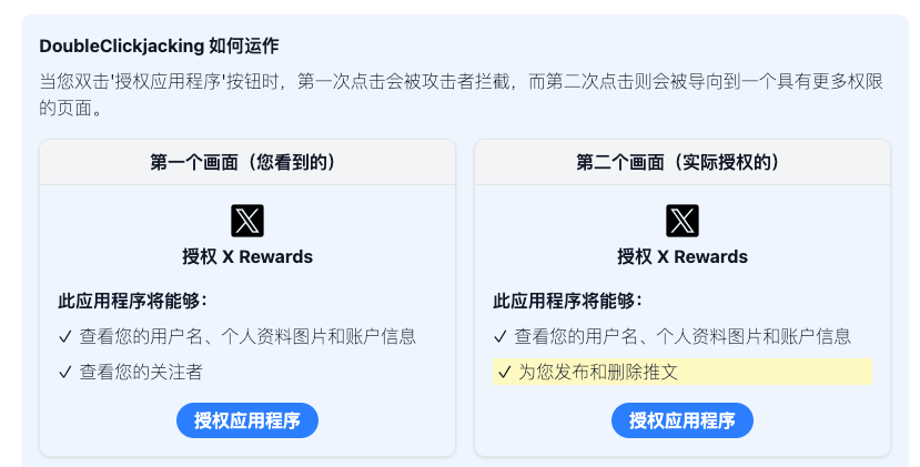 基本概念:DoubleClickjacking 是一种进阶点击劫持。攻击者伪装出与真实授权页几乎一致的界面,将真实目标页(如 OAuth 授权页)以叠加/对齐的方式置于可交互层之上或下方,诱导用户“双击”。页面强调它可绕过常见的 X-Frame-Options 与框架破坏脚本。